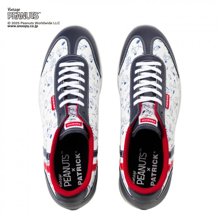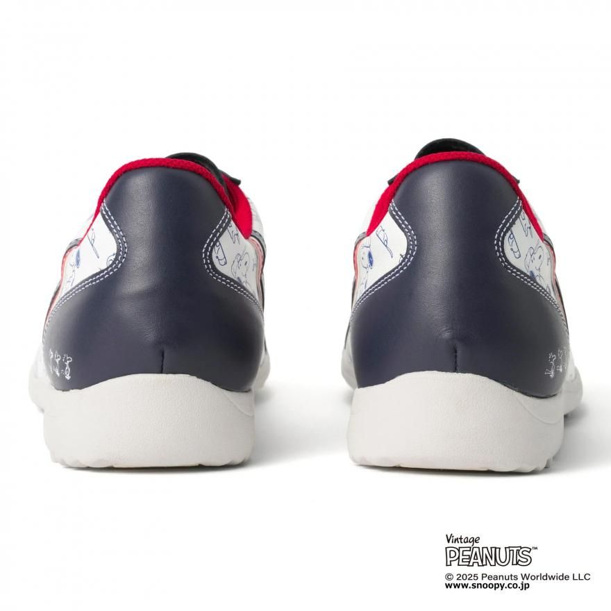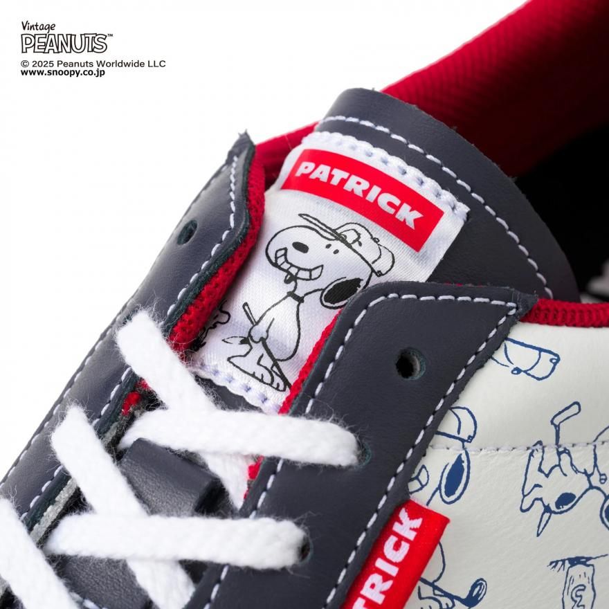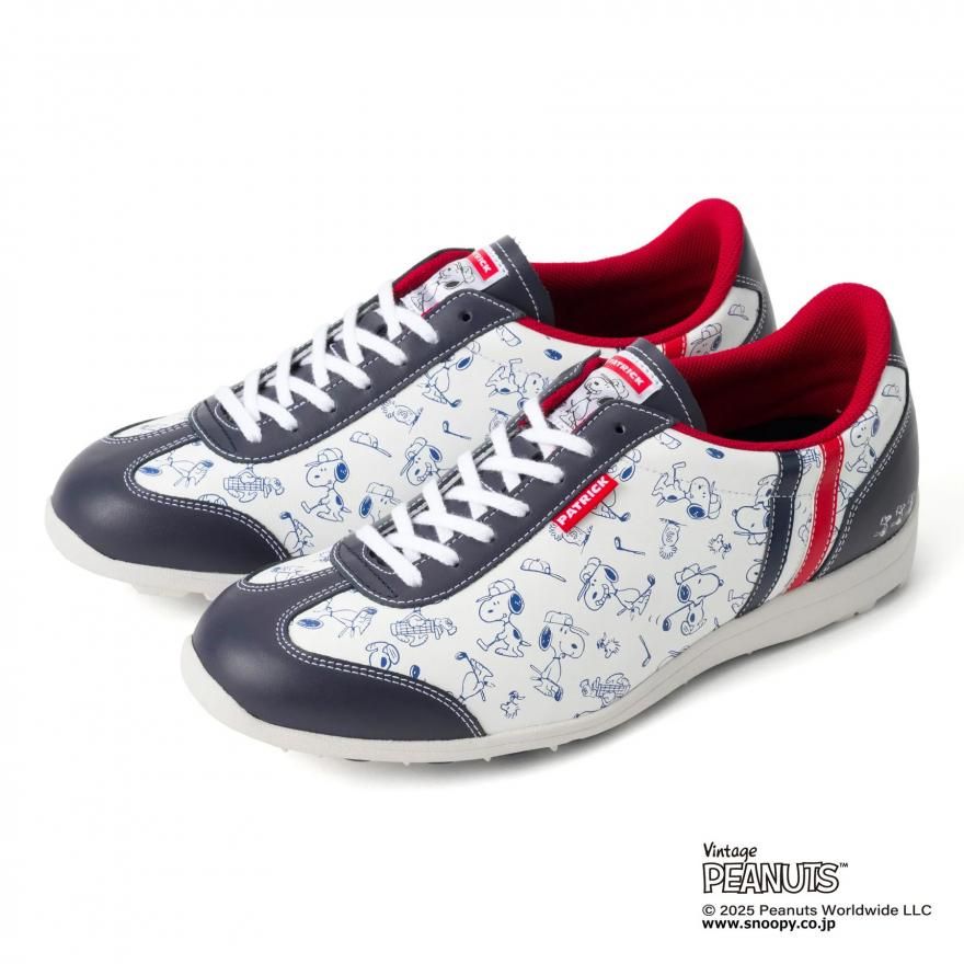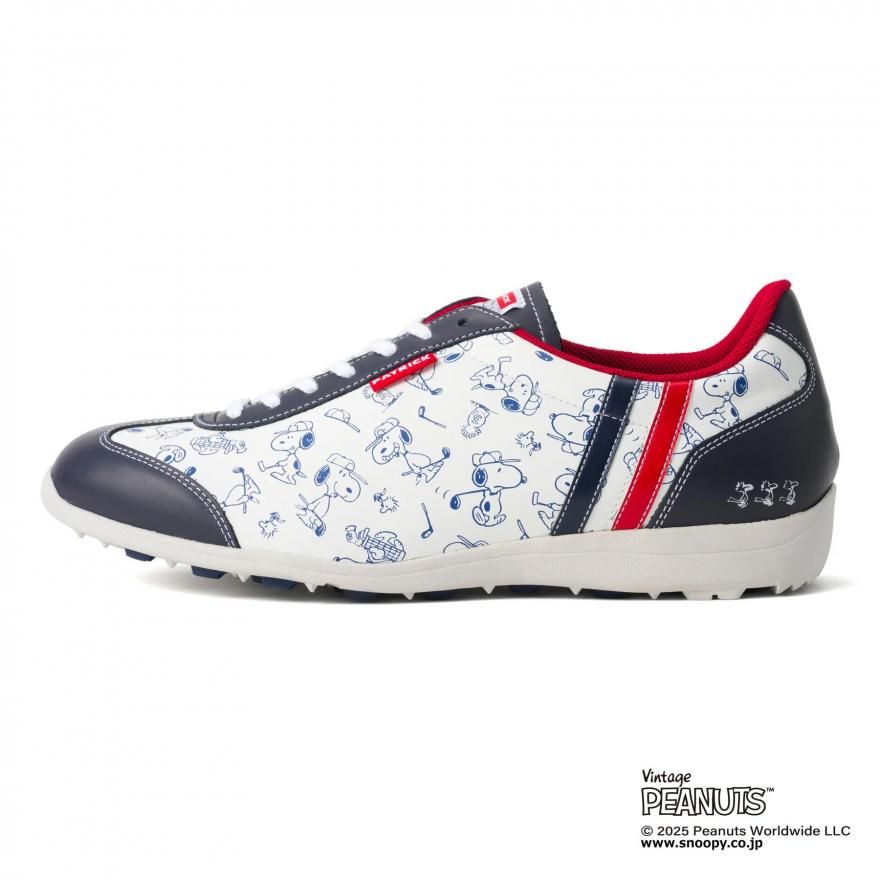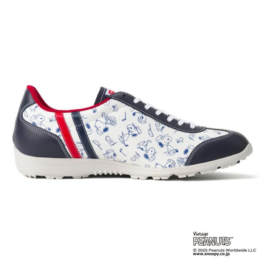 PAMIRのアッパーには、楽しげなスヌーピーとウッドストックのデザインをモノグラム調に配置。履くだけで気分もスコアも上がる(かも?)遊び心ある一足です。
