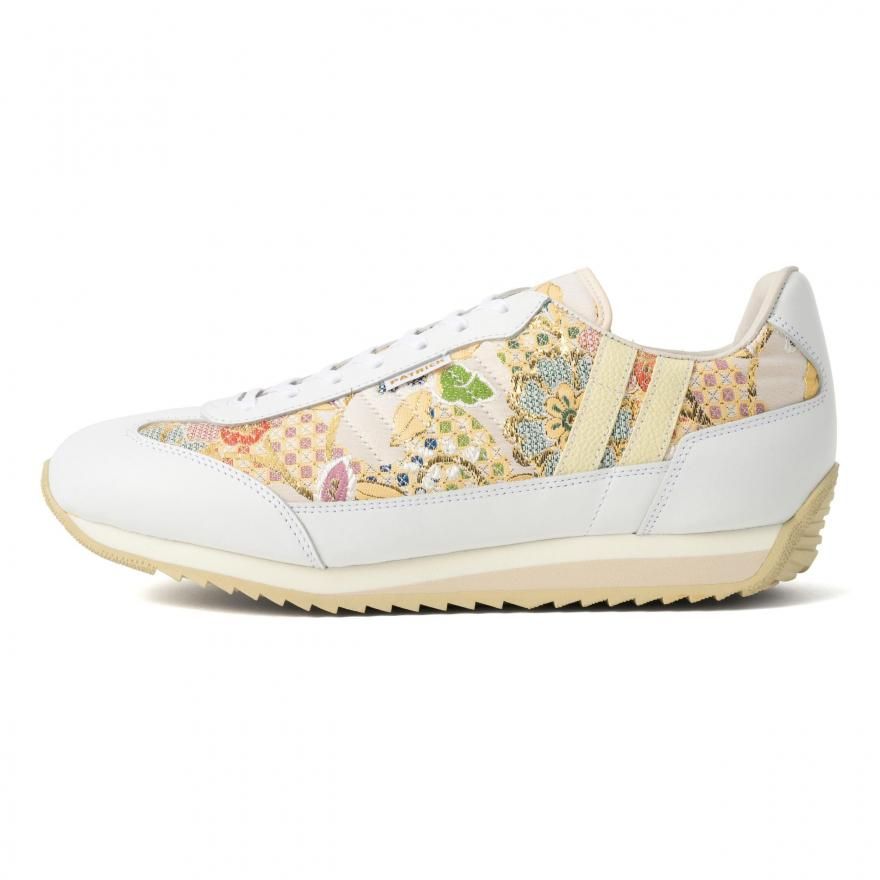西陣織金襴をアッパーに大胆採用した数量限定モデル。金糸が織り込まれた大柄の花紋様は左右で入り方が異なり、まるで一足ずつ異なるアートピース。ホワイトレザーの補強が和の重厚さに現代的な軽さを添え、唯一無二の存在感を放ちます。